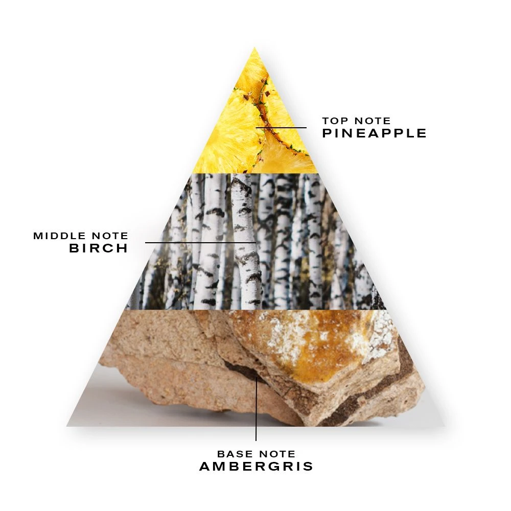 A sophisticated fruity and rich scent with notes of bergamot, blackcurrant leaves, apple, pineapple, pinkberries, birch, patchouli, jasmine, sandalwood, oakmoss, ambergris and vanilla.